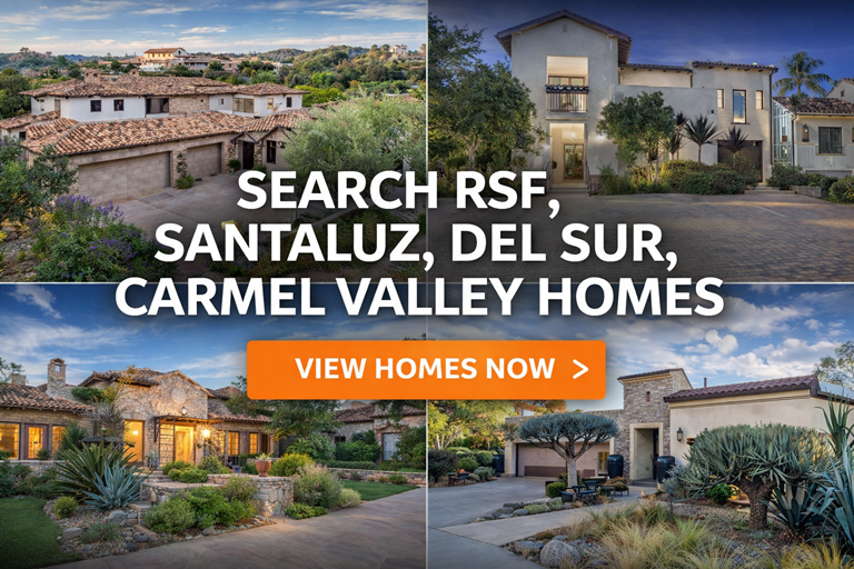 - Newer homes in Carmel Valley, Del Sur, Black Mountain Ranch, and Rancho Santa Fe