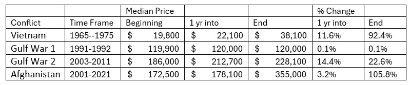 I recently reviewed historical data on how real estate performed during past conflicts, and the results were not what many people would expect. In the uploaded chart and table, several past conflict periods showed home prices remaining stable or rising over time. :contentReference[oaicite:0]{index=0}