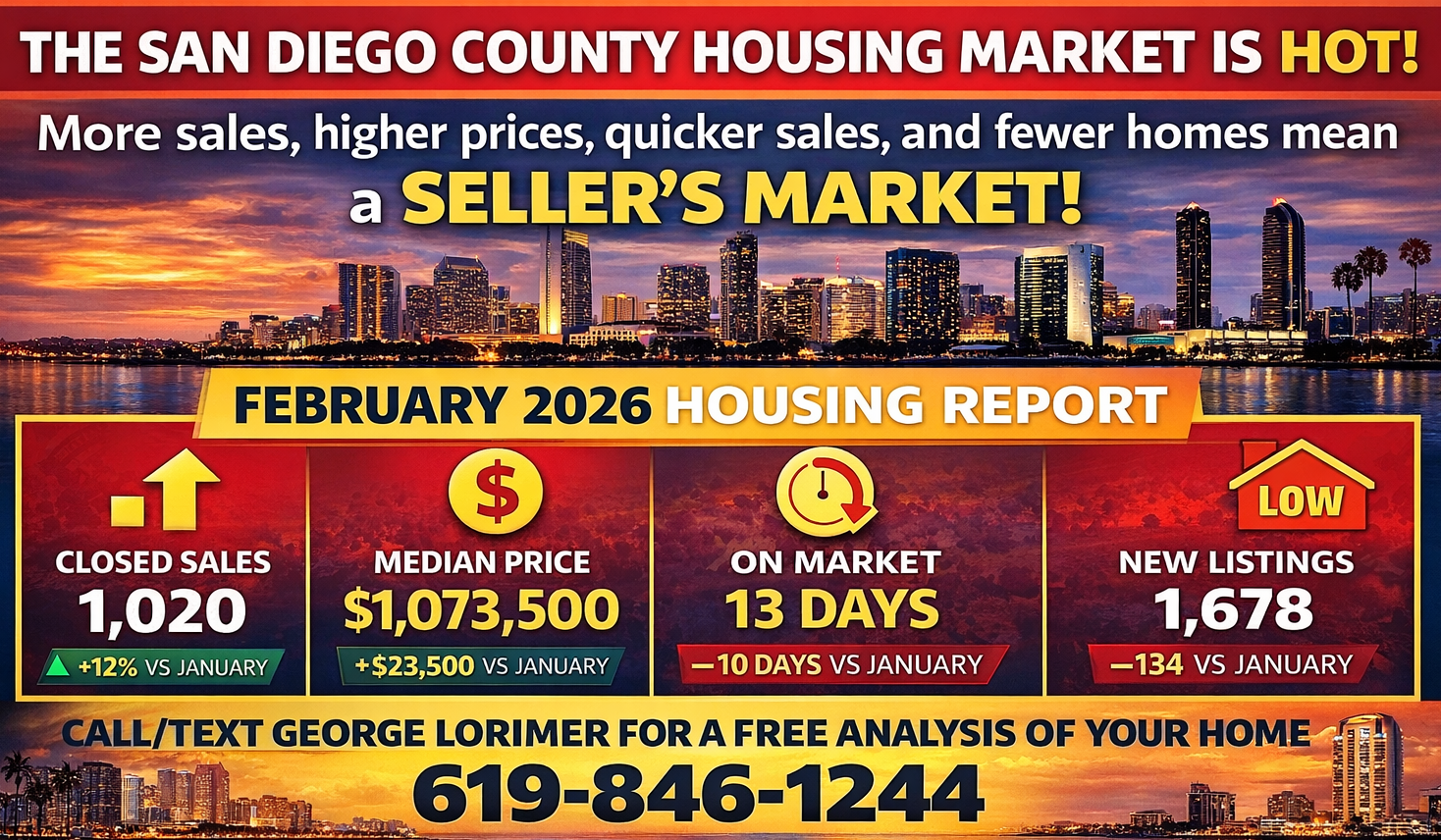 How to avoid the first mistake that San Diego home sellers makeIf you’ve been wondering what's going on in the San Diego housing market, here’s a quick reality check: The reason I tell you this is that there's an opportunity to buy at a good deal in this market. And if you're thinking of selling, don't price your home speculatively. For example, these speculative sellers say things like, "If I could get this price, I'd sell." (usually "their price" is higher than today's market value). For buyers, it becomes clear that the price may or may not have been based on today's statistics. For sellers, it's evident that unless you price it right, you may not sell. Here's my simple 3-step strategy that's helped over 1,000 sellers. 1) Determine that you are committed to selling. 2) Then price your home against competing listings, the homes buyers are comparing yours to. 3) Listen to feedback from the market and buyers and implement changes. Do this right, and you create urgency, competition, and the best chance of selling for top dollar. Call or text me, George, at 619-846-1244 to get your Complimentary Home Seller Report. All the best, George Lorimer Secret selling options that other agents don't offer.